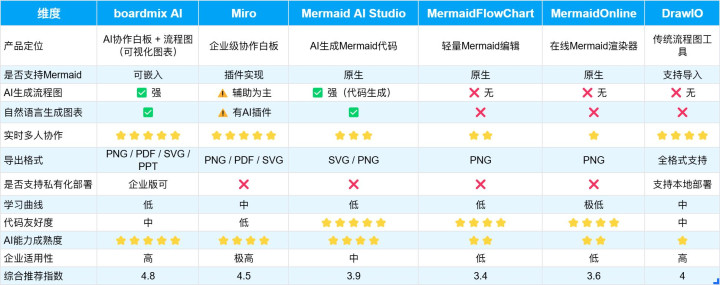 本文介绍的6款Mermaid代码生成流程图工具各有所长,boardmix AI和Mermaid AI Studio用AI降低了使用门槛,Miro和DrawIO提供了企业级的功能深度,MermaidFlowChart和MermaidOnline则坚守开源和极简主义。它们共同构成了Mermaid生态的丰富图景。