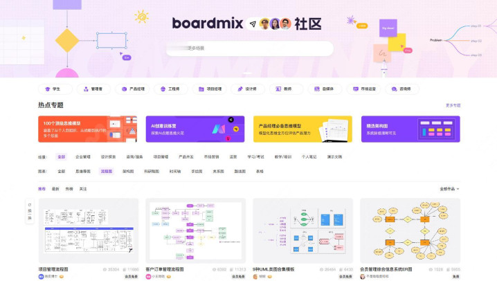 善用模板库 大部分工具都提供现成模板,比如软件开发流程、业务审批流程、算法逻辑图。找一个接近的模板,修改节点文本和连接关系,往往10分钟就能完成。boardmix的模板库还支持按行业和场景筛选,效率很高。