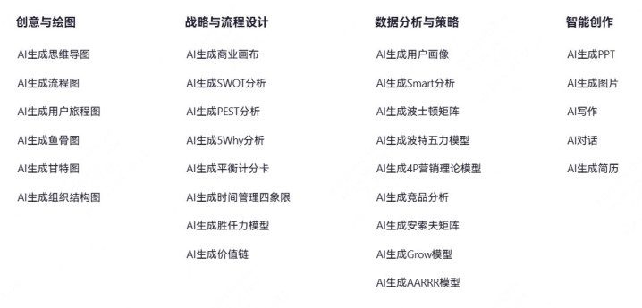 AI辅助能力:boardmix AI和Mermaid AI Studio在这项上显著领先,boardmix AI不仅支持Mermaid代码生成流程图,还可以生成各类常见的可视化图表,包括但不限于思维导图、架构图、鱼骨图、甘特图、SWOT分析、PEST分析、5Why分析、时间管理四象限、胜任力模型、价值链、用户画像、Smart分析、波士顿矩阵等。