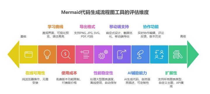选择一款合适的Mermaid代码在线生成工具,需要从多个维度进行综合评估,在选择Mermaid代码绘图工具时,可按下边经过实践验证的维度进行筛选: